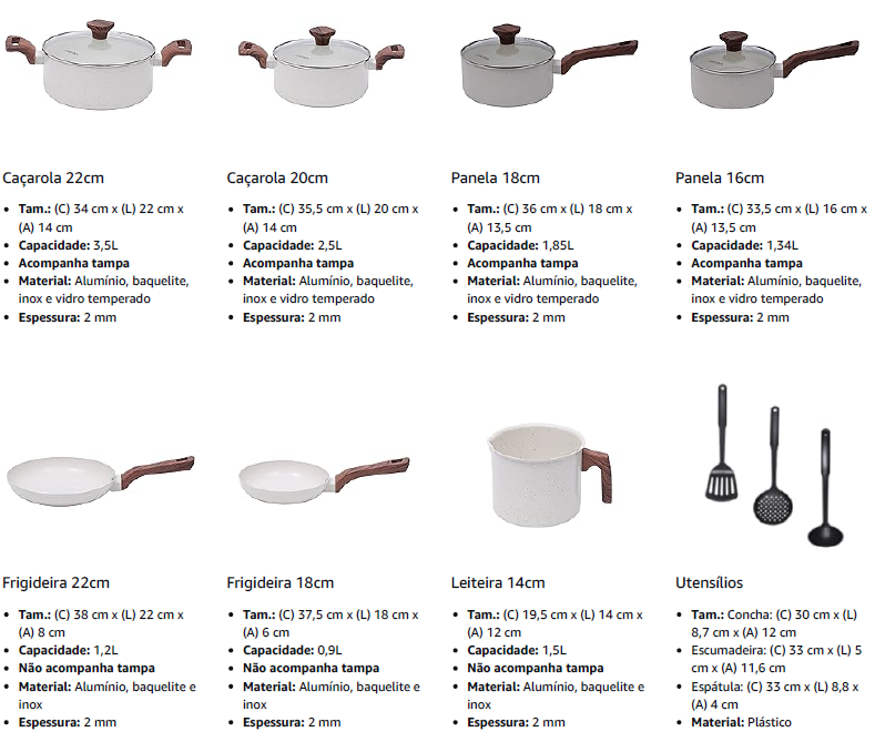 - Conjunto completo: caçarolas, panelas, frigideiras, leiteira e utensílios