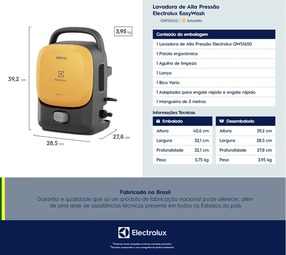 Se você quer economizar água e ganhar praticidade para lavar carro, bike e áreas pequenas, a Electrolux EasyWash QWS1650 (1650 PSI, 1400W) combina pressão adequada com design compacto. Ela é leve para transportar, fácil de guardar e resolve bem as limpezas do dia a dia sem exageros. Para quem precisa de uma solução doméstica simples e funcional, é um kit honesto e direto ao ponto.